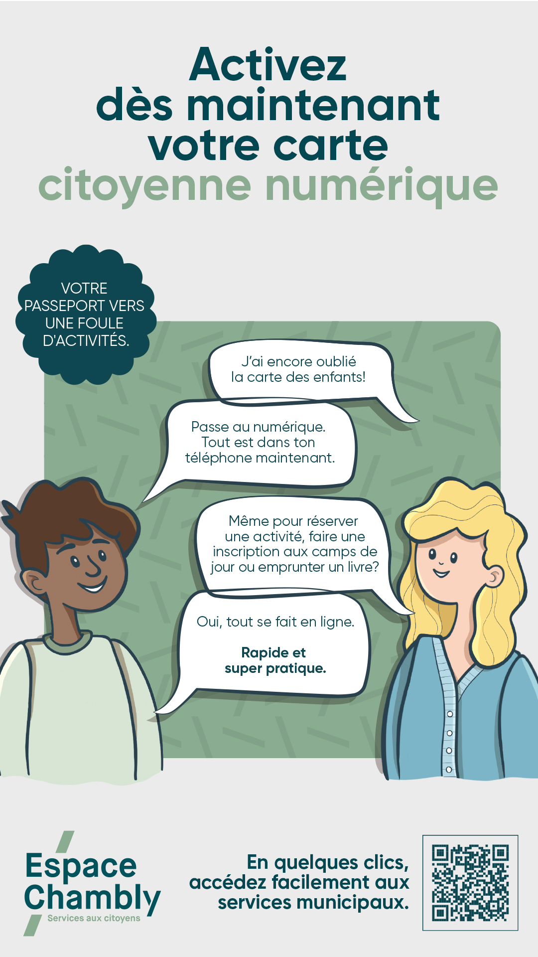 Vous avez déjà une carte Accès? Transformez‑la en carte citoyenne numérique directement sur le portail Espace Chambly. Sinon, créez-en une nouvelle, c’est simple et rapide.