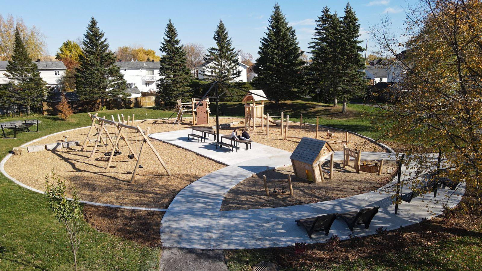 Afin de permettre à différentes clientèles de profiter des équipements, la nouvelle aire de balançoire propose des sièges traditionnels, nid d’oiseau et parent-enfant. Une aire de jeu en sable, une maisonnette, une aire sensorielle avec panneaux d’apprentissage et une table de ping-pong viennent compléter l’offre de loisirs. Au centre du parc, une aire de rassemblement munie de tables à pique-nique (dont une accessible pour les fauteuils roulants) permet à tous de se détendre tout en regardant les enfants s’amuser.